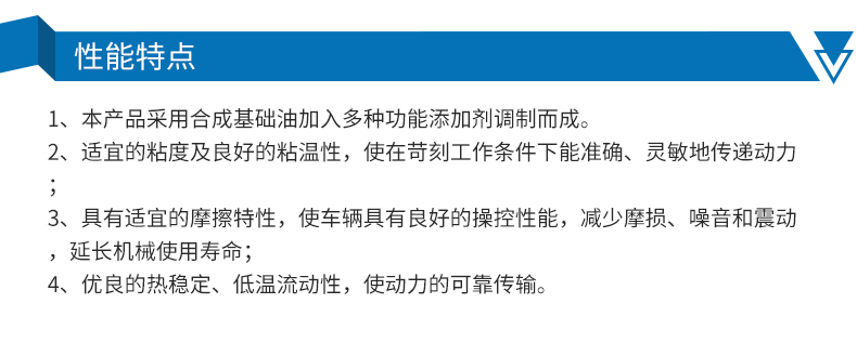 ●具有較好的燃油經濟性。較好的摩擦特性既降低燃油消耗,又提高了傳動平穩性,換擋感覺輕松。較好的抗磨損性能,持久保持潤滑能力。杰出的抗氧化和清凈性能,避免了油泥和漆膜物沉積,潤滑更順暢,油品使用壽命長。優異的低溫流動性,適用各種嚴酷環境。
