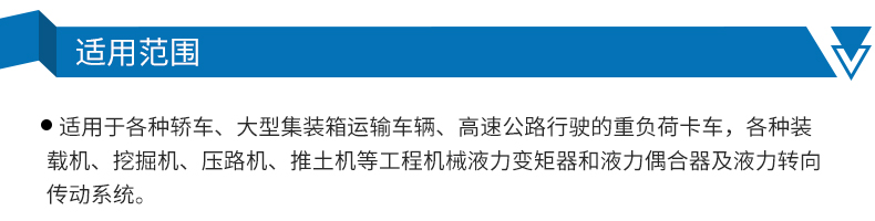 滿足所有重型裝備原始設備制造商(OEM)及行業要求,包括卡特彼勒T0-4規格。適用于內燃機車及載重礦車、工程機械等的液力傳動系統;適用于所有轎車、輕型商用車和工程車的手動或半自動變速箱和扭矩轉換器;適用于靜液傳輸裝置和動力轉向裝置及要求使用DEXRON-Ⅲ級別的自動變速箱油的液壓系統。